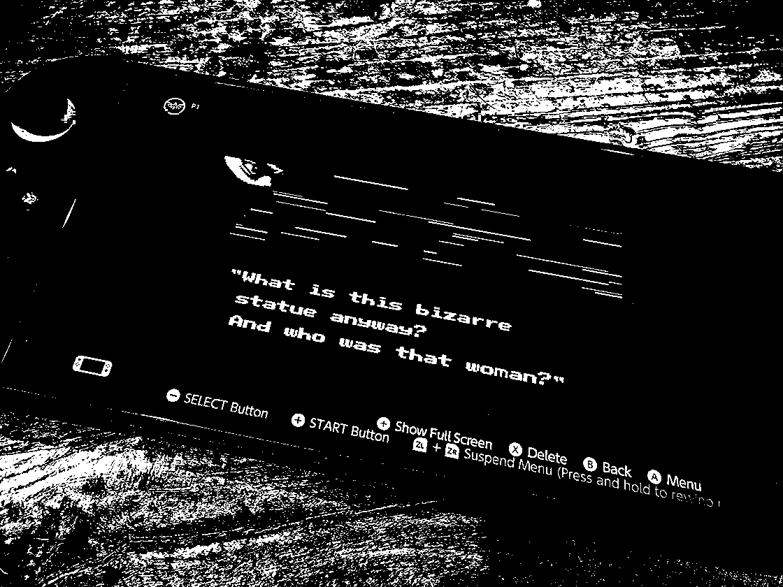 Picture comes from a Ninja Gaiden session on the Nintendo Switch, inverted using Photoshop. I did fire it up again; the controller has a slight lag that takes getting used to—the input isn’t quite perfect. I still made it to the temple without using a continue.